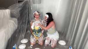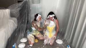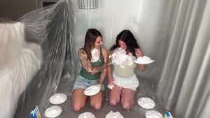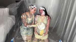 We are surrounded by lots of big pies and decide to start grabbing handfuls and sensually rubbing them on each other, our swimwear starts to get covered and we pour custard pies down each others shorts. It feels very sexy and soon our swimwear comes down to expose our breasts. We end up completely naked, pieing each other's pussy's and sensually rubbing ourselves over each other.