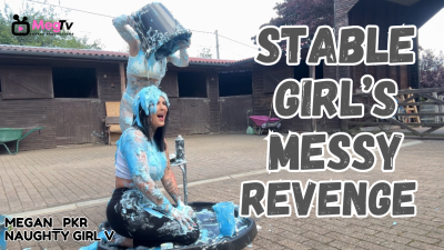 Sticky Vicky was very disappointed in my attempt to muck out the stables, laughing at what I was wearing, she decided I needed punishing. She poured gunge and custard on my head and pied me when I wasn't expecting it but I wasn't messy enough for Sticky Vicky and she continued to gunge me until I resembled a smurf.